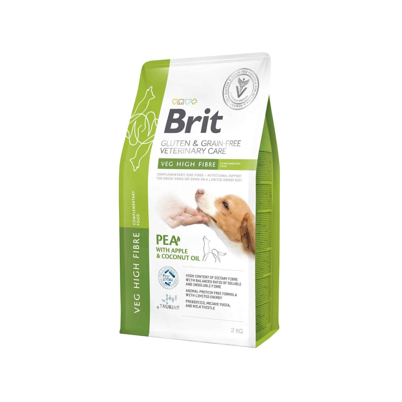 Brit Veterinary Diet Veg High Fibre este un supliment alimentar funcțional (hrană complementară), 100% vegetarian și fără cereale, conceput pentru câinii care au nevoie de un aport suplimentar de fibre în dietă. Acesta se amestecă cu hrana zilnică pentru a ajuta la instalarea senzației de sațietate (fără calorii extra) sau pentru a regla tranzitul intestinal în cazurile de colită ce răspunde la fibre. Fiind bazat pe mazăre, linte și psyllium, este ideal și pentru câinii cu alergii la proteine animale.