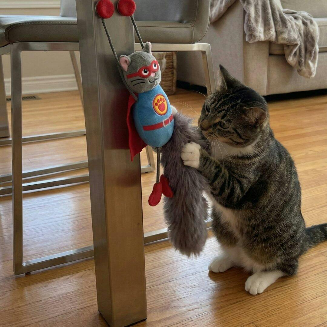 Designul său unic include magneți încorporați în lăbuțele superioare, permițându-ți să atașezi figurina de ușa frigiderului sau de alte suprafețe metalice. Astfel, jucăria rămâne suspendată la înălțimea ideală, provocând pisica să se întindă, să sară și să lovească prada care "sfidează gravitația".