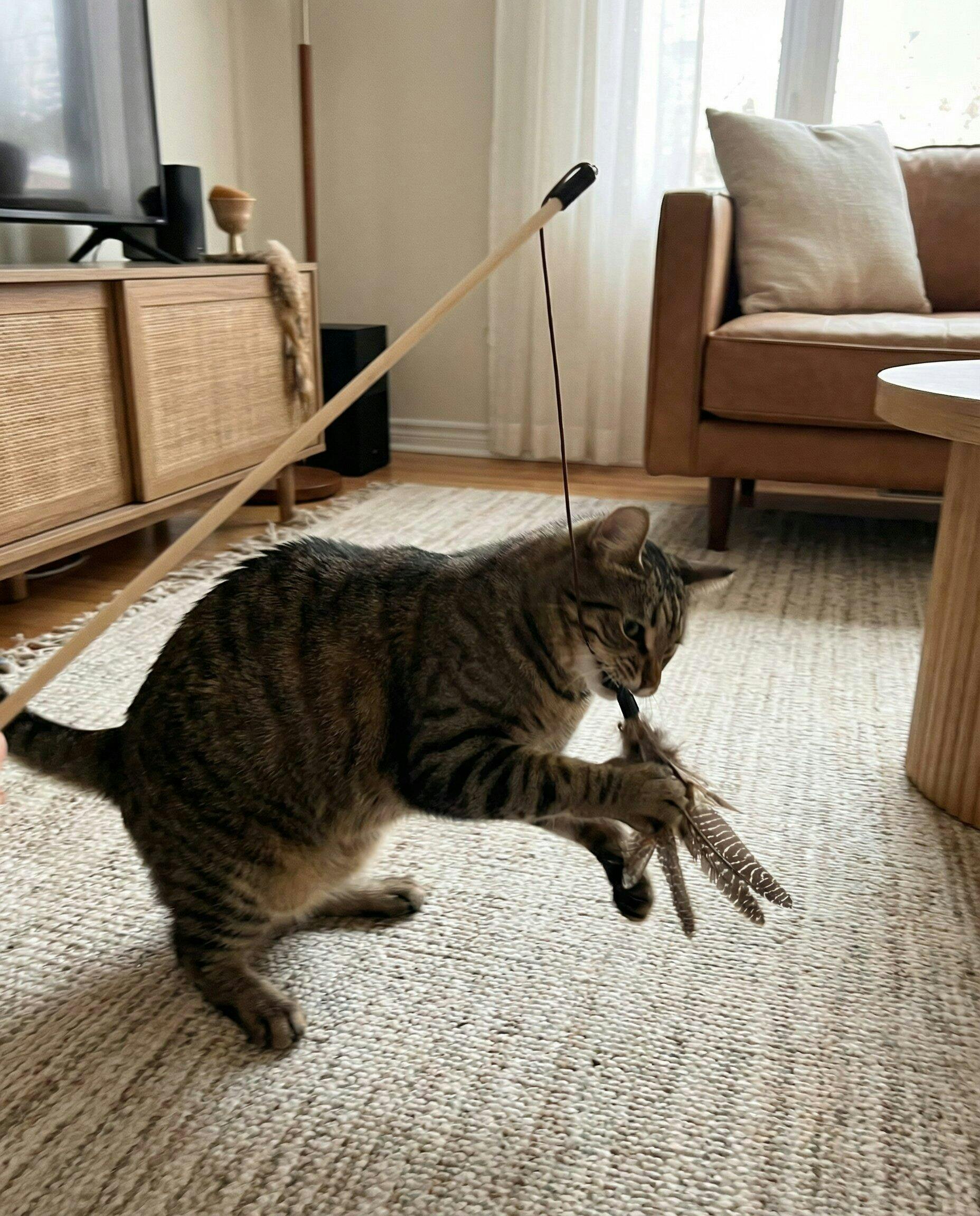 Exercițiu Fizic: Încurajează săriturile și sprinturile, fiind excelentă pentru menținerea greutății optime a pisicilor de apartament.