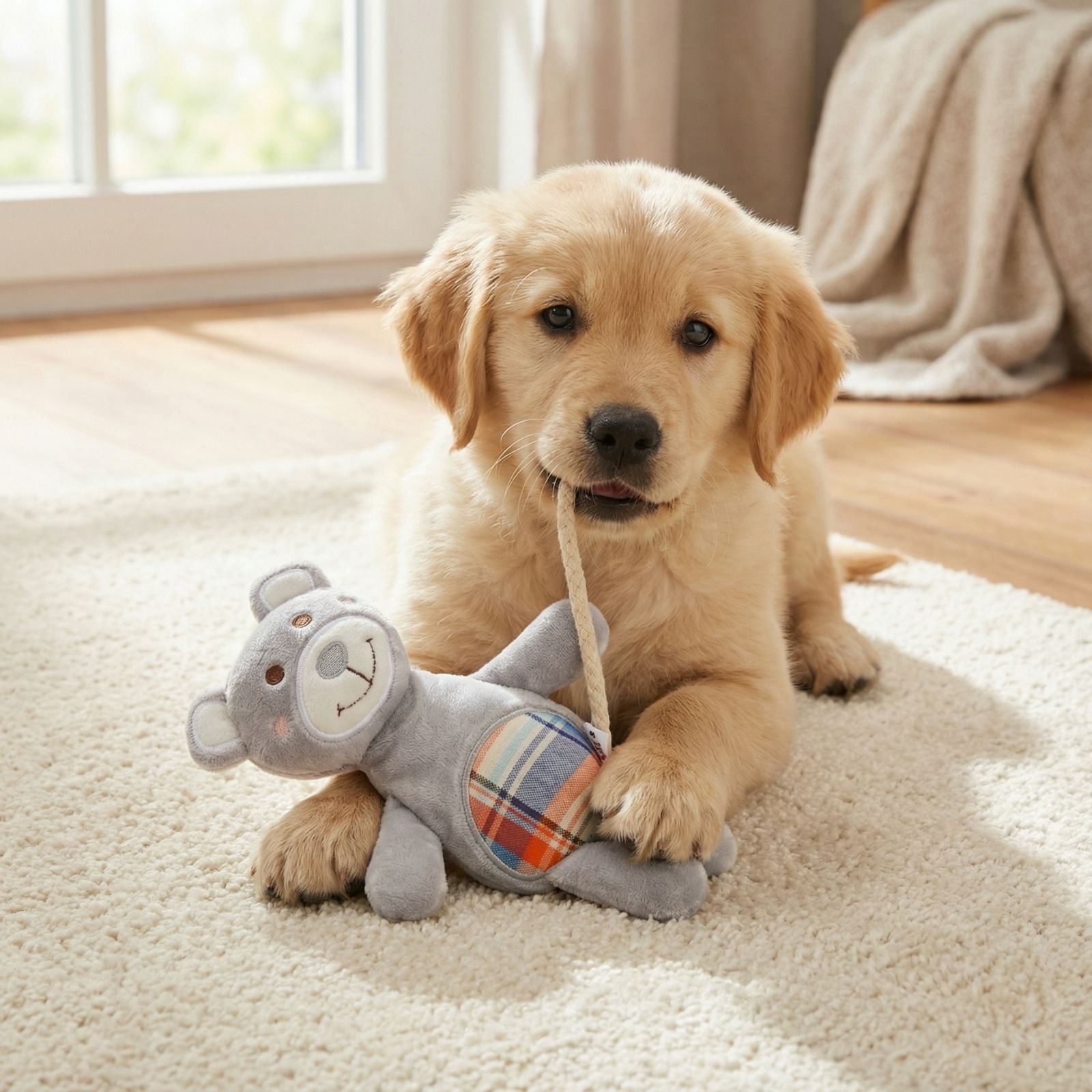 Design 2-în-1: Combină funcția de jucărie de confort (pluș) cu cea de jucărie activă (sfoară).