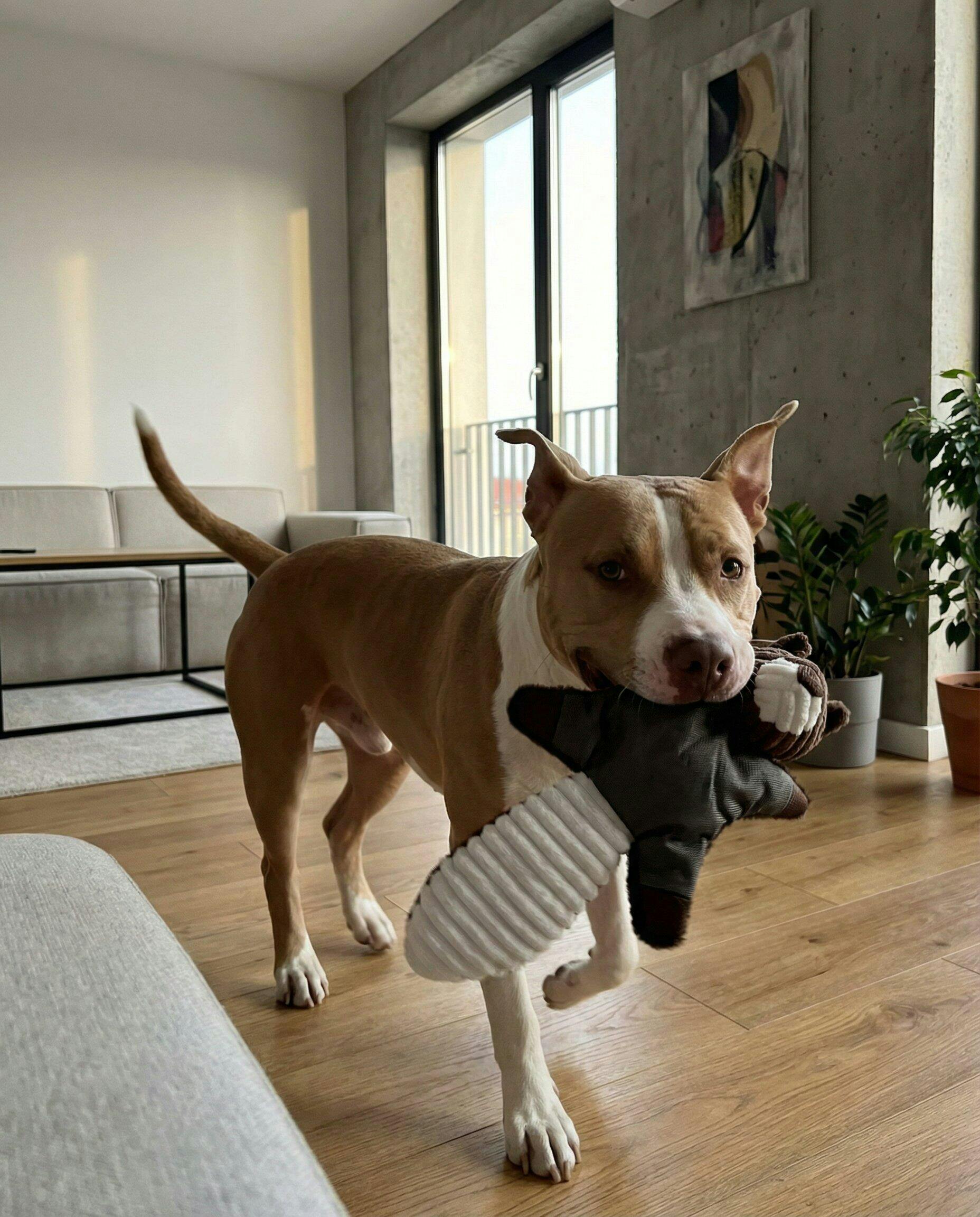 Dimensiune Generoasă (39x18.5 cm): Ideală pentru câini de talie medie și mare, fiind suficient de voluminoasă pentru a nu fi înghițită și perfectă pentru "îmbrățișat".