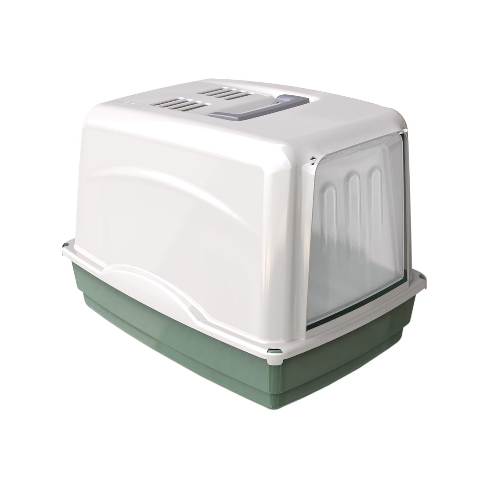 Designul robust, fabricat din plastic durabil și non-toxic, include tot ce ai nevoie pentru a menține casa curată: o ușiță batantă care reține nisipul în interior și un sistem de filtrare (capacul este prevăzut cu spațiu pentru filtru de carbon) care neutralizează mirosurile neplăcute.