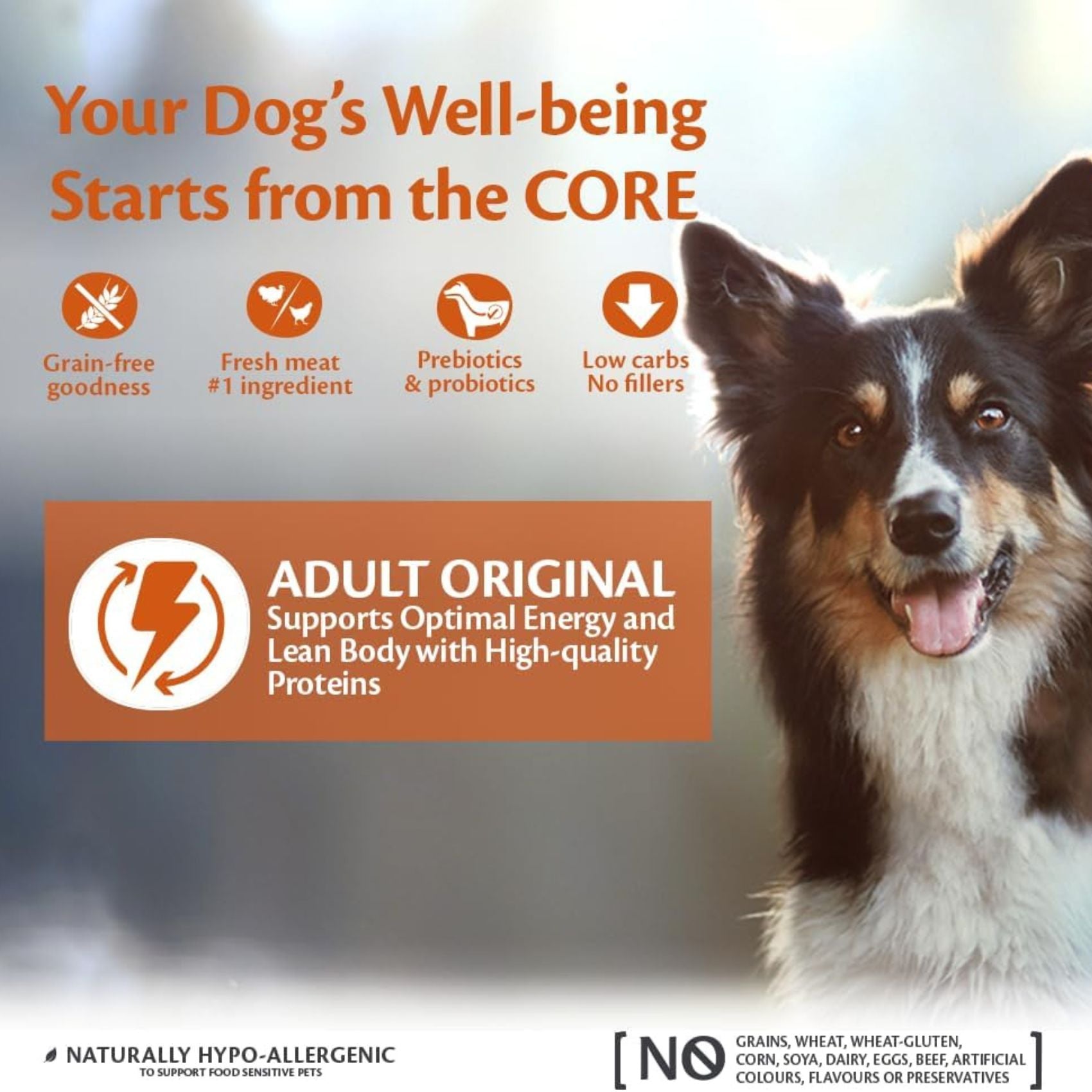 Fără Cereale (Grain-Free): Fără grâu, porumb, soia sau gluten – ideal pentru câinii cu sensibilități.