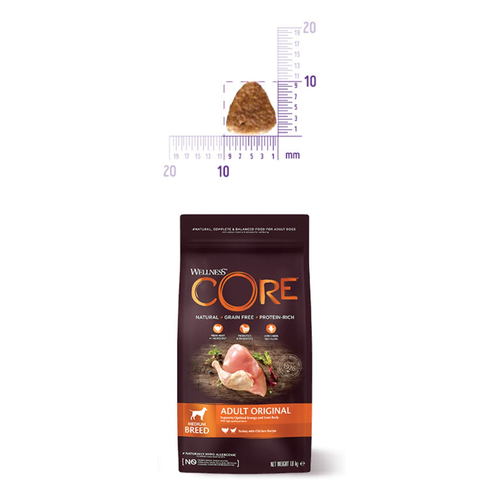 Wellness CORE Adult Original – Hrana Uscata pentru Caini Talie Medie, cu Curcan si Pui, Fara Cereale, 10 kg